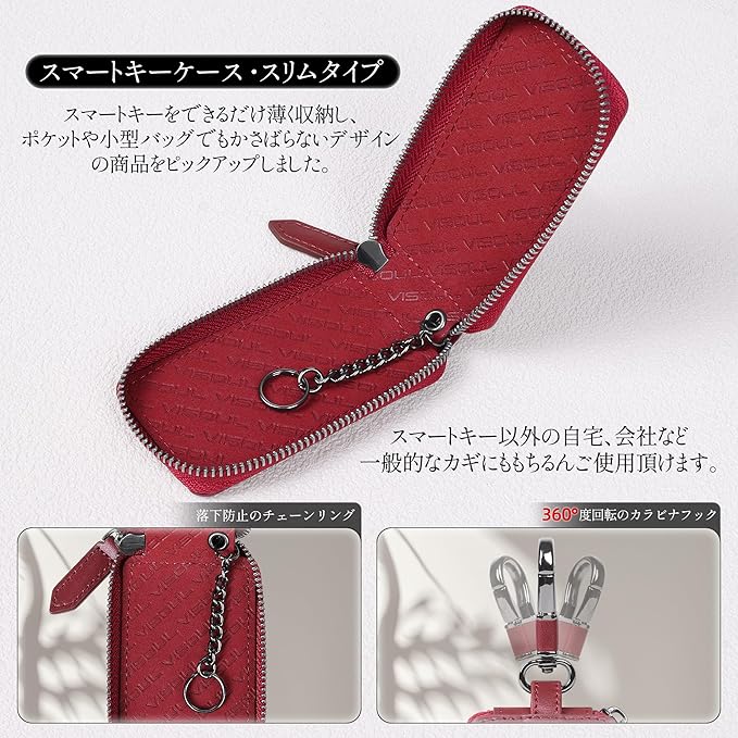 【360度回転カラビナ】カラビナが360度回転タイプで、手のひらサイズ利用する時にはとても便利です。ズボンやバッグなどに引っ掛けることができ、普段の持ち運びに活躍します。【チェーン付きリング】ケース内にスマートキーを繋ぎとめるチェーンを付き、万が一、ファスナーを閉め忘れた時に、キーの落下を防ぎできます。