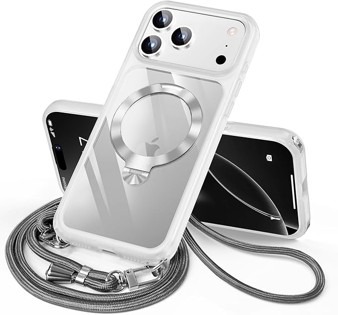 iPhone 17 Pro Max 用 ケース メッキデザイン & 特別なCD調スタンド」隠しストラップホール付き 多機能360度回転スタンド MagSafe ワイヤレス充電対応 耐衝撃 カメラレンズ保護 6.9インチ いphonePro Max 用 ケース 薄型 おしゃれ スマホケース(クリア, iPhone 17 Pro Max)