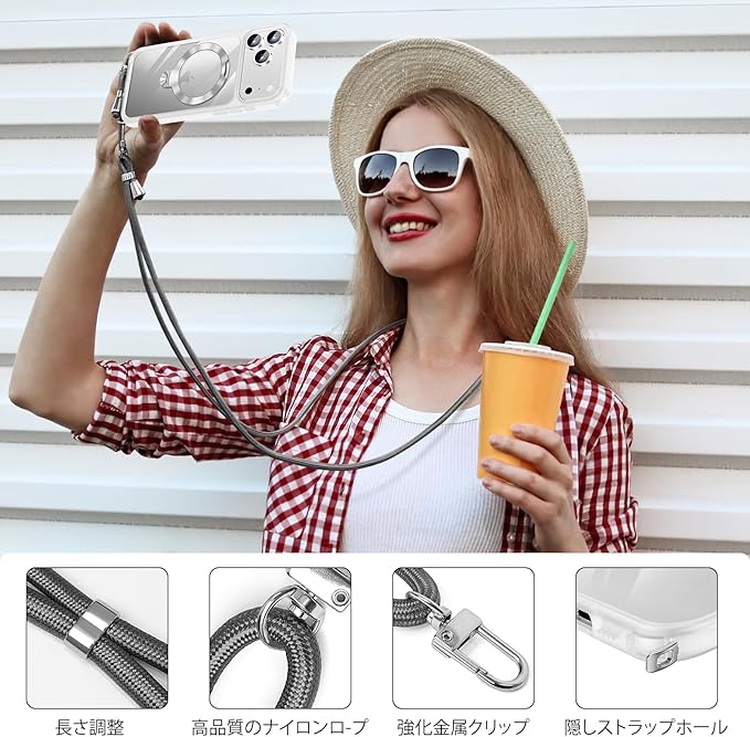 【隠せるストラップホール】 必要に応じて使える隠しストラップ穴付き。付属のショルダーストラップは長さ調整可能で、肩掛けや斜め掛けが可能。落下防止や両手解放で、旅行・ショッピング・撮影・サイクリングに便利。
