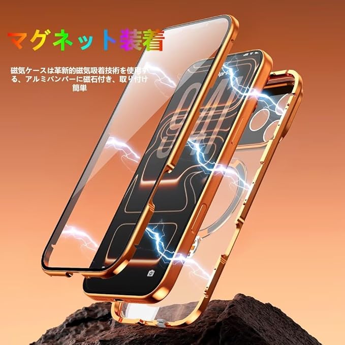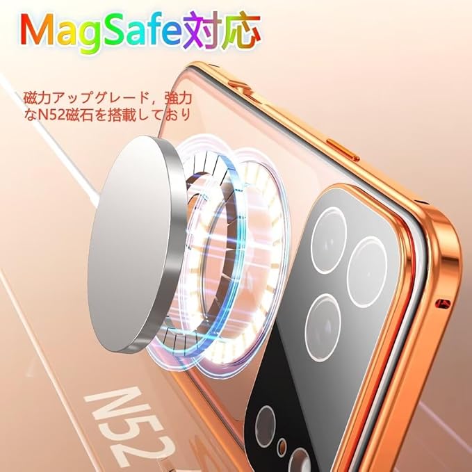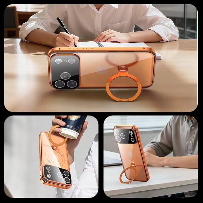 【スタンド機能付き・360 定点回転】MagSafe対応 iPhone17 Pro Max 用 ケース クリア ロック付き MagSafe対応 9H強化ガラス PC背面 一体型レンズ保護 両面 アルミバンパー メタルフレーム ワイヤレス充電対応 アイホン17プロマックス 用 カバー スマホケース,オレンジ