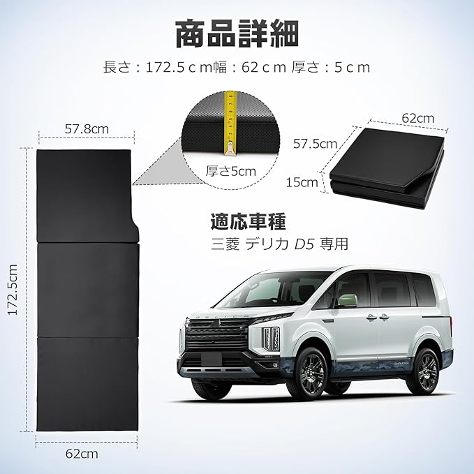 1.【適合車種】:三菱 デリカ D5 に適用。型式:CV1W/CV2W/CV4W/CV5W型。年式:2019年2月~現行。※8人乗りと7人乗りに対応致しますが、念のためサイズをご確認の上ご購入下さい。【セット内容】車中泊マットx1pセット。【寸法】長さ172.5cm、幅62cm。※左右側兼用専用設計なので、トランク全体がベッドとして使用したい人は、2枚を購入することをおすすめ!※購入する前、形状、年式とモデルを確認してください。