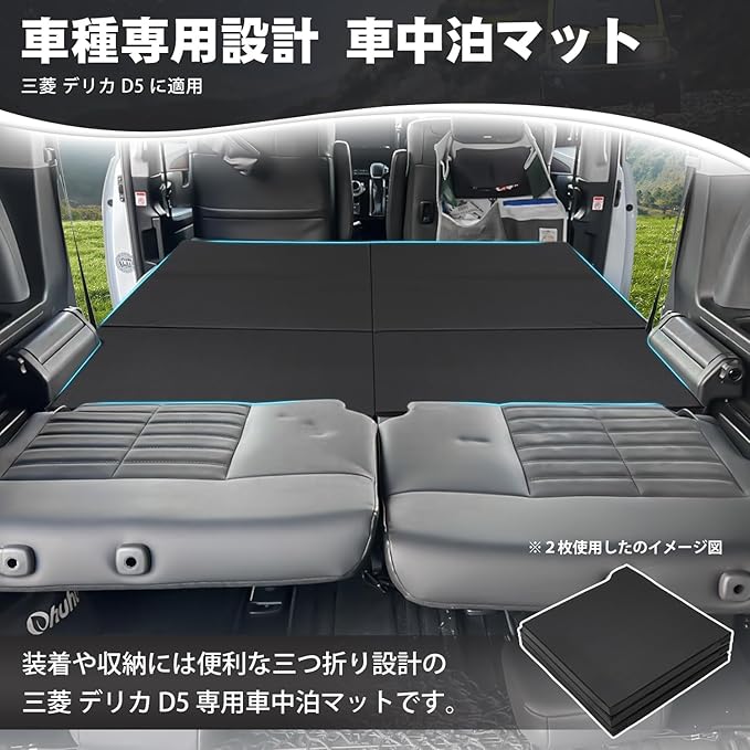 3.【車中泊快適 ・様々な用途】「旅行や仕事の長距離の移動中に横になって休みたい」そんな願いを叶えてくれる、 デリカ D5 CV系 専用の車中泊マットです。厚みは約5㎝で、サッと広げてどこでも寝られます。室内あるいはアウトドアの場合には、ソファ、ベッド、テント寝台として使用できます。レジャー、ドライブ、防災など幅広くご使用いただけます。旅行などの景色で車中泊してベッドにすることもできます。車内全体がベッドとして使用したい人は、2枚を購入することをおすすめ~