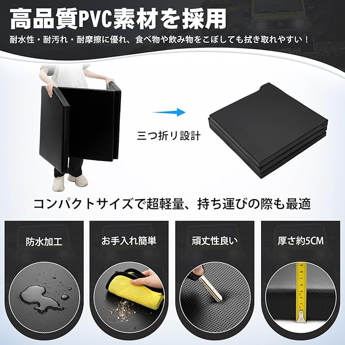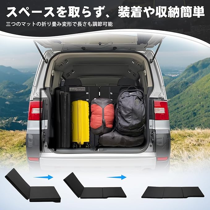 5.【三つ折リコンパクト専用設計・装着や収納が簡単】装着や収納には便利な三つ折り設計のジムニー専用車中泊マットで、お車にぴったり合うように設計されています。三つ折りたたみ式で、取り出して置くだけ装着すぐ完了!お手入れはめちゃ簡単❕使わないときは、折りたたんで収納完了。
