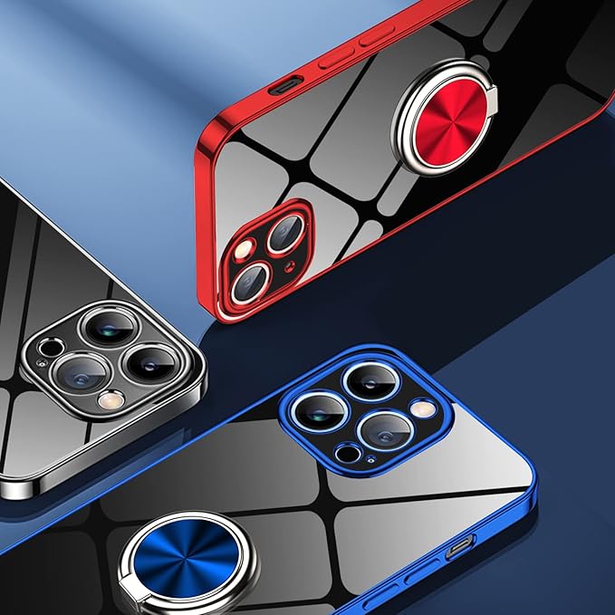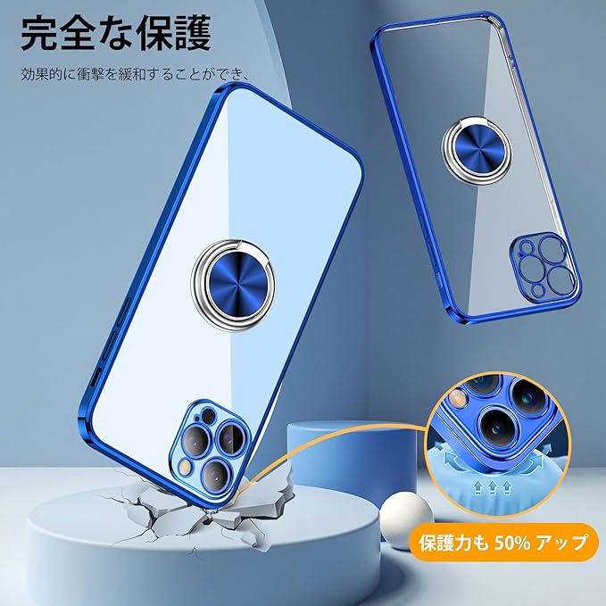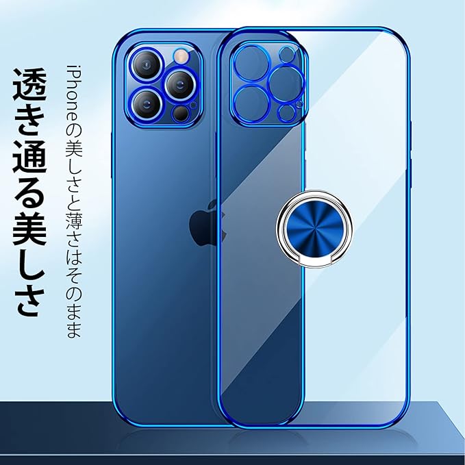 対応 iPhone 13 Pro Max 用の ケース クリア リング付き TPUケース 車載ホルダー メッキ加工 スタンド機能 透明 薄型 アイフォン13 pro max 用のカバー 全面保護 軽量 シリコン 黄変防止 ストラップホール付き レンズ保護 滑り防止 人気 携帯カバー 青 YZ1-38