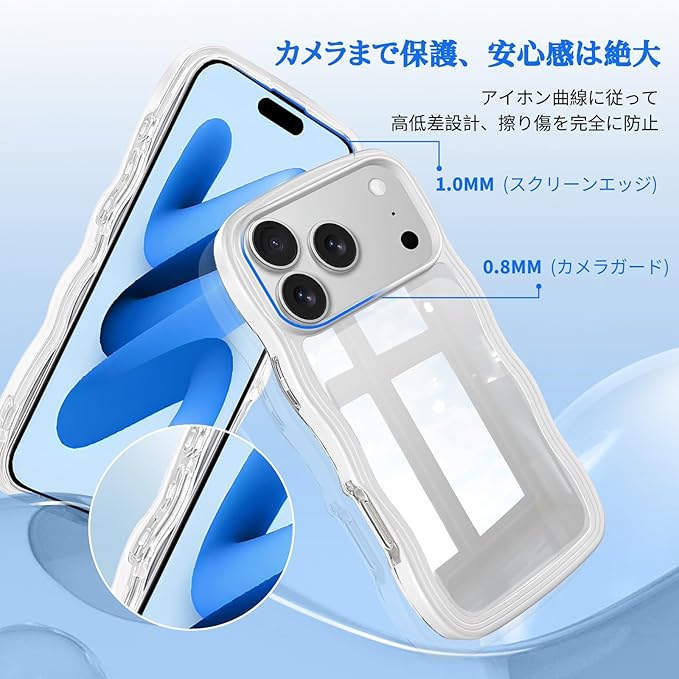【全方位保護】ケースのカメラ部分は、 あいほん17 Pro Max のカメラレンズよりも高い位置に設定されており、レンズを傷から守ります。また、波型のエッジにはある程度の厚みを持たせているので、万が一 いphone 17 Pro Max を落下させてしまった場合でも、通常のケースよりも全方位的に大切なレンズと画面を保護します。