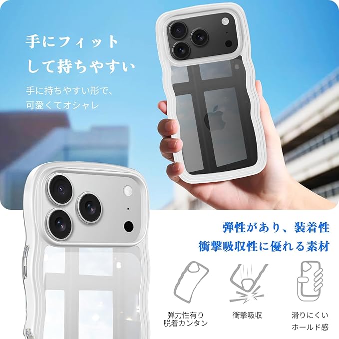iPhone 17 Pro Max 用 ケース クリア 透明 うねうね 背面ケース スマホケース 可愛い 波型 アイフォン17 Pro Max 用 カバー 耐衝撃 滑り止め ストラップホール付き 全面保護 iPhone 対応 カバー 持ちやすい 6.9インチ 韓国 人気 ホワイト