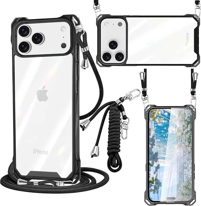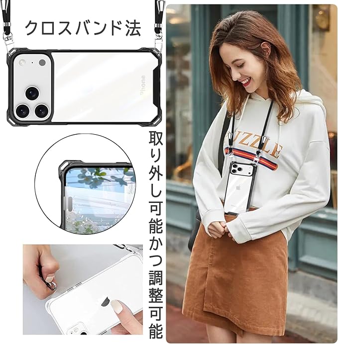 iPhone 17 Pro Max 用 ケース クリア PC ショルダー 軽量 耐衝撃 カバー アイフォン17 Pro Max ケース 透明 薄型 PC背面 + TPUバンパー 二層構造 携帯ケース 首掛け 肩掛け 斜めかけ 縄掛けケース 1.5M 取り外し可能 縦/横 2WAY 衝撃吸収 (パープル)