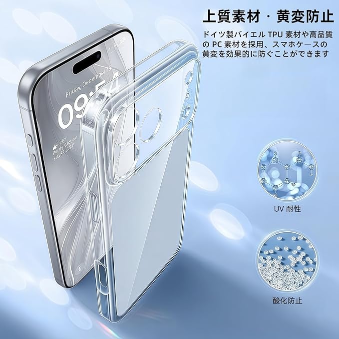 【黄変防止強化素材】高品質 PC 素材とドイツ製バイエル TPU を採用、iPhone 17 Pro Max の美しさを損なうことなく維持。TPU ポリマーに UV 剤を添加し黄変防止力を大幅向上させ、長期使用でも光沢と透明感を保ちます。またワイヤレス充電対応で、急速充電も可能で生活を便利快適にします。