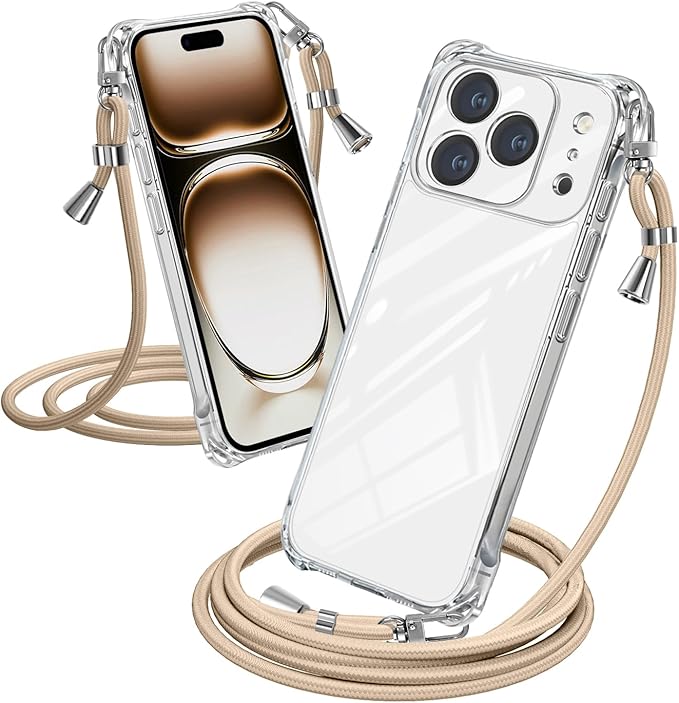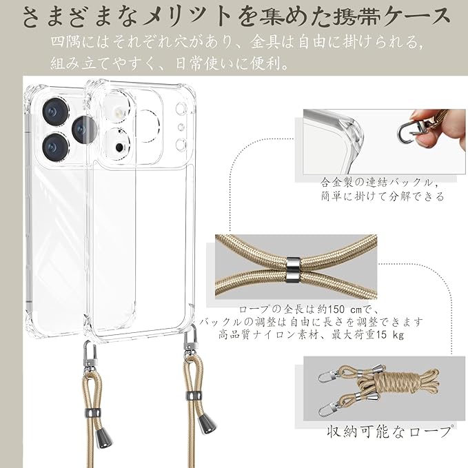 iPhone 17 Pro Max 用の ケース クリア ショルダー 耐衝撃 アイフォン17 Pro Max カバー ストラップ 透明 スマホケース 肩がけ 首掛け 紐付き 縄掛け 斜めがけ 調節可能なショルダー TPUスマホ (ゴールド)