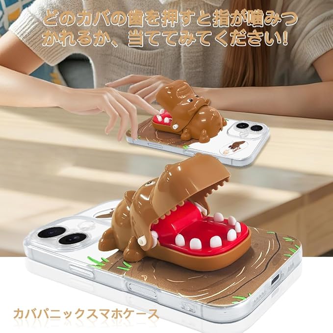 【カバパニック】リラックスできる簡単なゲームとスマホケースを一体化した製品で、非常に使いやすい設計です。 さらにスマホスタンドとしても使用可能で、背面にはカバの形をしたおもちゃが付いています。使用方法の具体的な説明は画像で確認できます。