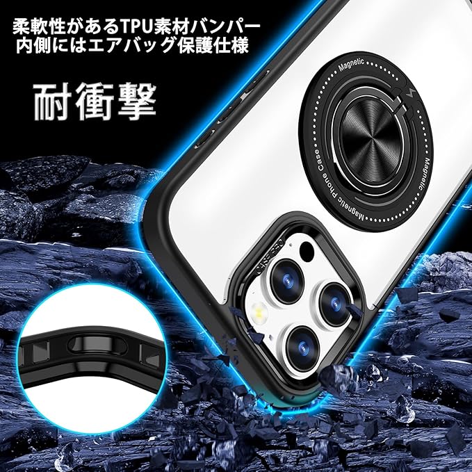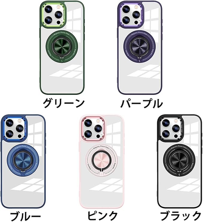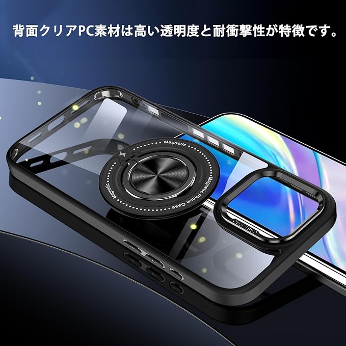 iPhone 15 Pro Max 用 ケース 背面リング スタンド機能 クリアケース カメラ枠メタリック TPU クリアPC 耐衝撃 薄型 軽量 アイフォン15プロマックス カバー ストラップホール iPhone15ProMax 車載ホルダー Magsafeアクセサリー対応 (iPhone 15 Pro Max, パープル)