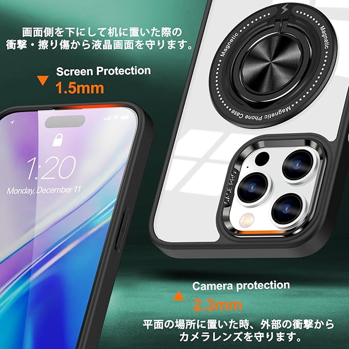 【車載ホルダー・Magsafeアクセサリー対応】 背面リング部分の土台は金属製なので、マグネット式の車載スマホホルダーに装着可能です。 MagSafe電源グループ・MagSafeウォレットに対応しております。