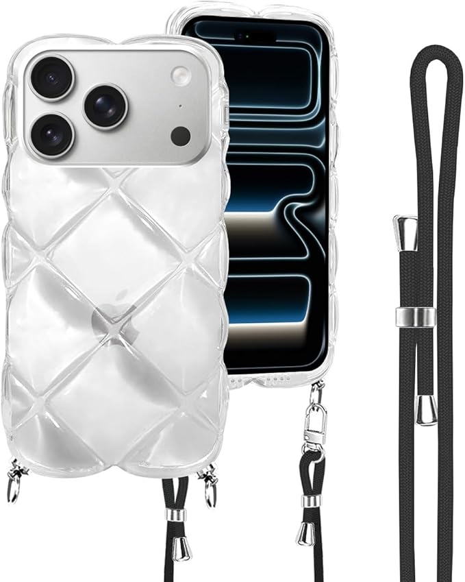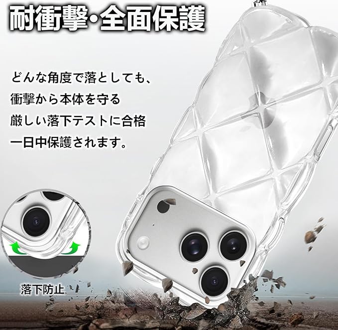 For iPhone 17 Pro Max 用 ケース クリア ショルダー ウェーブ 菱形バック いphone 17 pro max うねうね スマホケース TPU 菱形 凸凹 可愛い 耐衝撃 超軽量 アイフォン17プロマックス 6.1インチ用 肩掛け 斜めかけ 縄掛け 透明TPU 取り外し可能 落下防止(クリア)