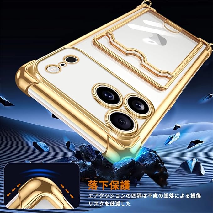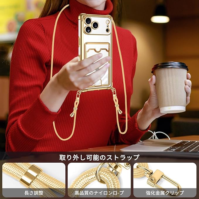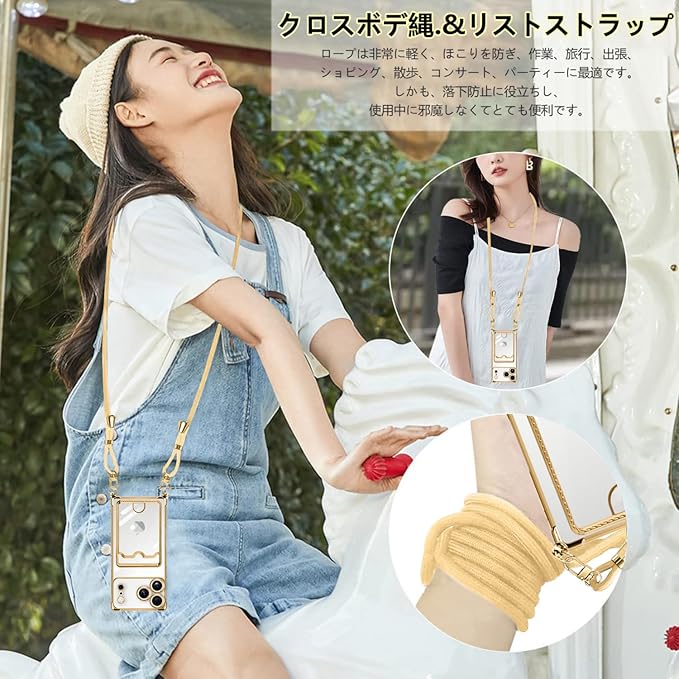For iPhone 17 Pro Max ケース クリア ショルダー iphone 17 pro max カバー カード収納 アイフォン 17Pro Max スマホケース 肩掛け 首かけ 斜めがけ 縄掛け ケース 透明 TPU 耐衝撃 薄型 軽量 カード入れ 財布型 スマホケース 調節可能な 落下防止 紛失防止 (ゴールド)