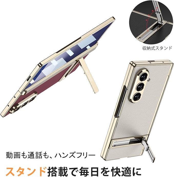 【上質レザーと光沢フレームが織りなす、洗練のデザイン】フレーム部分には繊細な光沢を放つメッキ仕上げを採用。金属のような質感がZ Fold 7本体と美しく調和し、持った瞬間に感じる“ワンランク上”の存在感。手元を上品に引き立てます。背面には、上質なレザー素材を採用しており、指紋や汚れが付きにくく、さらりとした触り心地で長時間の使用でも快適。見た目の美しさと機能性を両立した、こだわりの質感設計です。触れるたびに、その上質さを実感いただける逸品です。