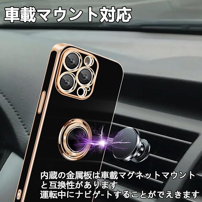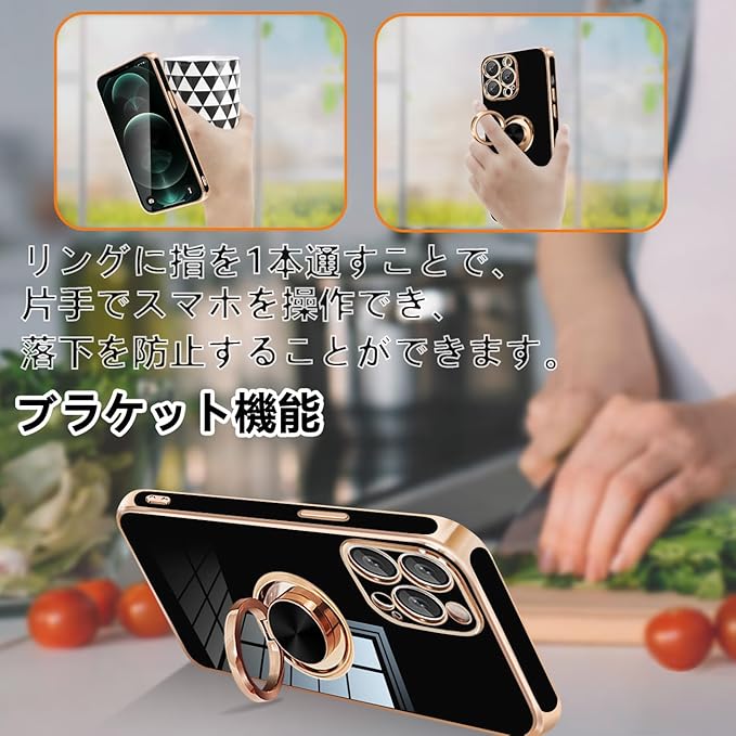 SIG iphone 12ProMax ケース リング付き カバー メッキ加工 耐衝撃 車載ホルダー アイホン 12プロマックス ケース 360 回転 スタンド機能 ストラップホール付き スマホケース 米軍MIL規格 SGS認証 TPU 滑り止め 衝撃吸収 携帯ケース カメラ保護 ソフト 12ProMaxケース 6.7インチ用(ブラック)