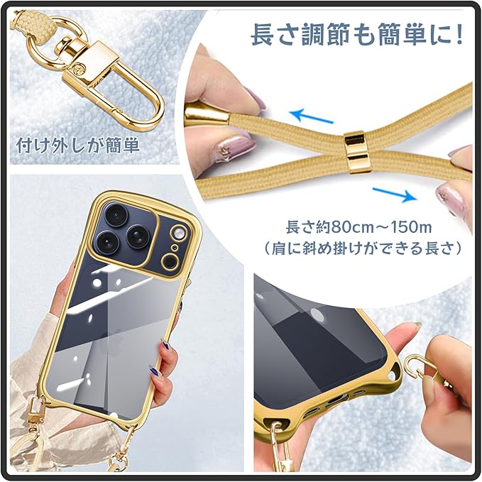 iPhone 17 Pro Max 用の ケース ショルダー ストラップ iPhone 17ProMax 用の カバー クリア 斜めかけ 肩掛け 首掛け 韓国 アイフォン17 プロ マックス 用の スマホケース ゴールド