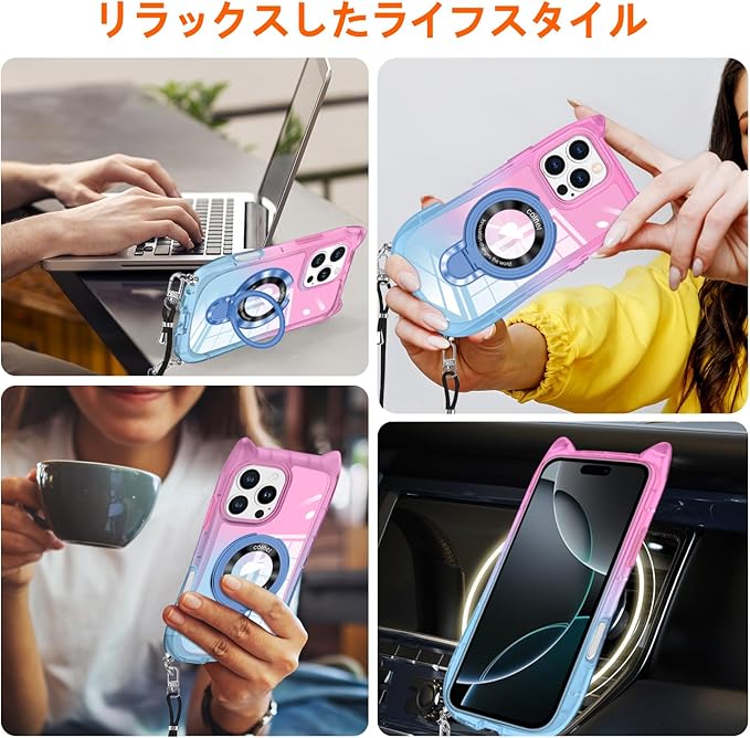 iPhone 17 Pro Max 用 ケース クリア MagSafe対応 リング付き TPU バンパー ネック ショルダー あいほん 17 promax カラー 猫耳 携帯カバー 肩掛け 首掛け 斜めがけ 紐付き 韓国 かわいいファッション 耐衝撃 車載対応 アイフォン 17 PRO MAX スマホケース