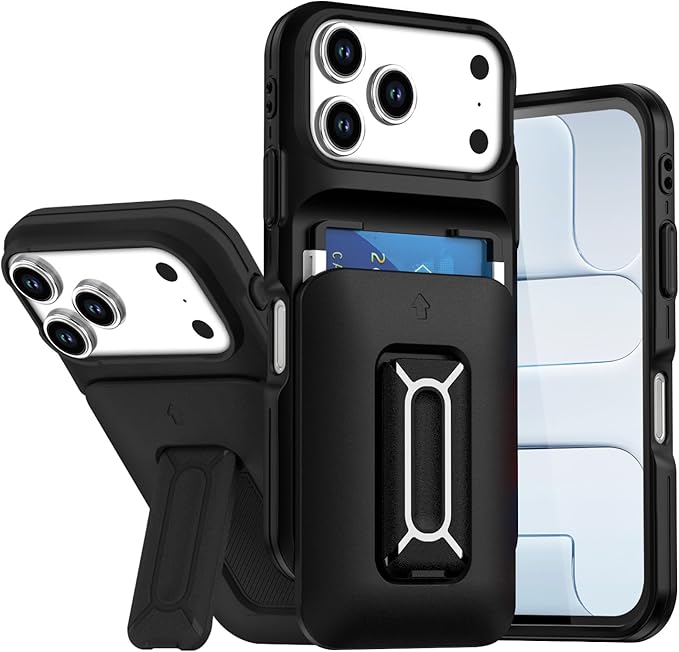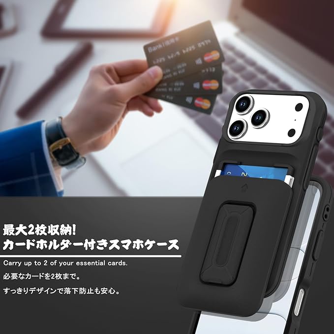 対応 アイフォン17 Pro Max ケース, iPhone 17 Pro Max ケース カード収納2枚 & スタンド付き 耐衝撃 カメラレンズ保護 米軍MIL規格 指紋防止 ストラップ穴付き 全面保護(ブラック)