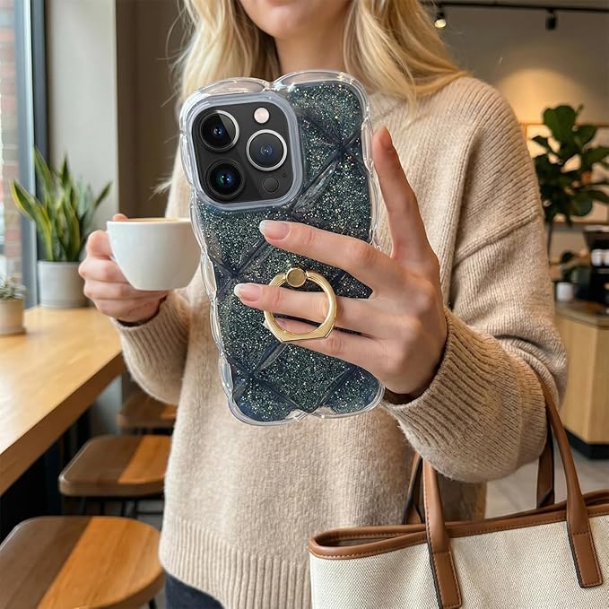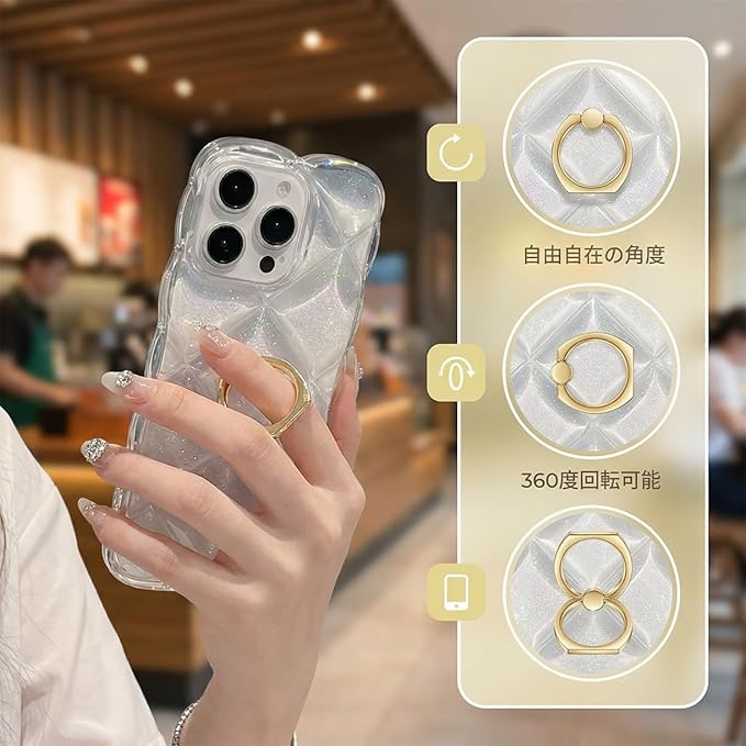 iPhone 17 Pro Max ケース クリア リング付き 360 回転 ウェーブ 菱形バック キラキラ いphone 17 pro max カバー 耐衝撃 iphone 17 pro max 用 カバー軽量 可愛い 韓国 人気 スマホケース おしゃれ 透明 TPU 滑り止め 落下防止 柔軟 黄変防止 ケース(クリア)