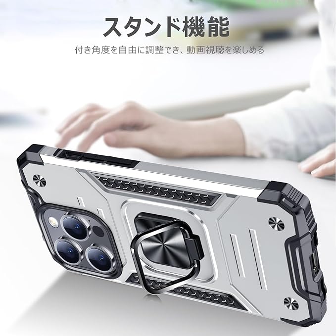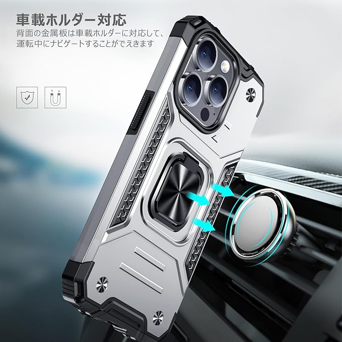 iPhone 15 Pro Max 用ケース リング 衝撃吸収 耐衝撃 TPU+PCバンパー 二重構造 米軍MIL規格 全面保護カバー 滑り防止 車載ホルダー対応 擦り傷防止 滑り止め 軽量 薄型 アイフォン 15 pro max 用カバー 6.7インチ 指紋防止 耐久 おしゃれ 人気 携帯カバー 銀 MZ62-95