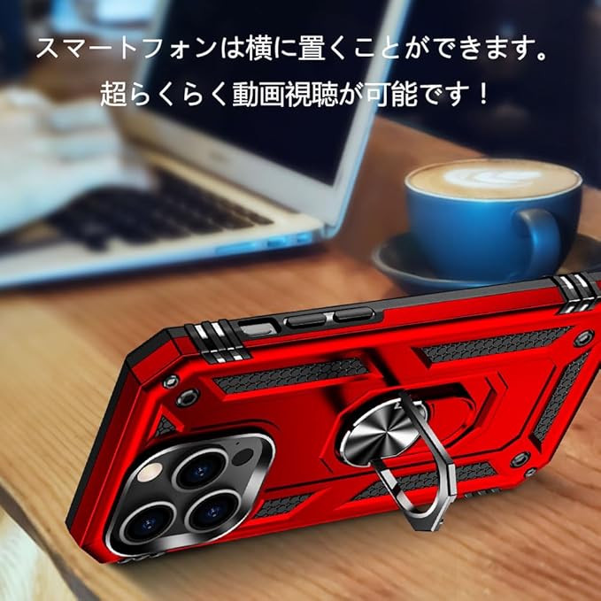 iPhone 14 Pro Max 用のケース リング 耐衝撃 衝撃吸収 傷防止 全面保護 カメラ保護 スタンド付き TPU+PCバンパー 指紋防止対策 二重構造 360度回転 防塵 車載ホルダー対応 黄変防止 米軍MIL規格 軽量 薄型 耐傷性 安心保護 滑り止め 人気 携帯カバー 赤 MZ61-68