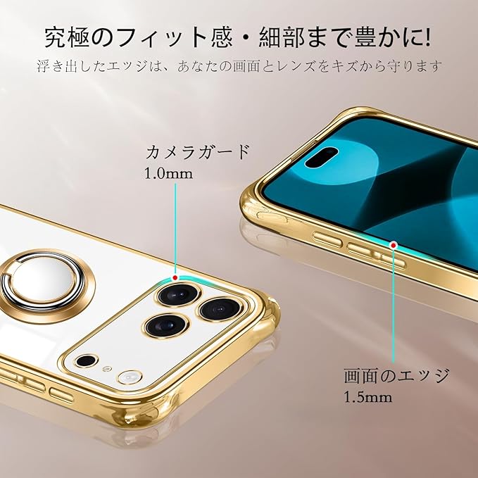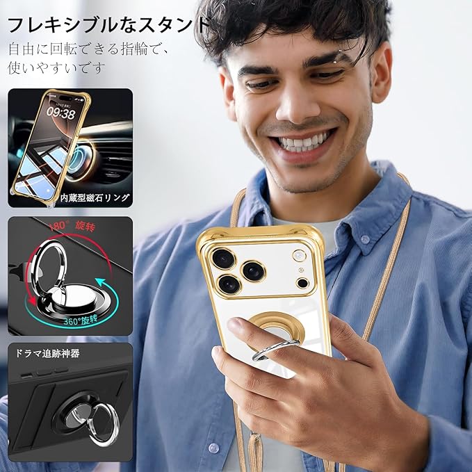 iPhone 17 Pro Max ケース クリア ネック リング付き ショルダー アイフォン17 pro max カバー 耐衝撃 対応 いphone 17 pro max スマホケース 360 回転スタンド 肩掛け 斜めかけ 縄掛け ケース 透明 TPU ストラップ付き 薄型 軽量 紐付き ネックストラップ ショルダー 肩掛け 縦/横 2WAY 長さ調整可能 取り外し可能(ゴールド)