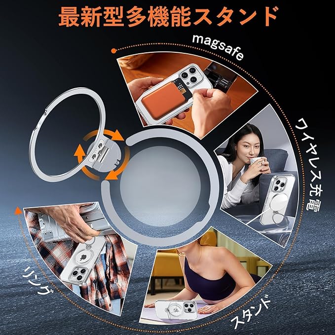 【両リング!新次元のケース】ユニークなマグネット環とリングスタンドの複合構造のデザインを採用しており、スタンドを使って携帯電話で映像や動画を見ながらワイヤレス充電ができます。無線充電器の上に平置きにして充電しかないという悩みを解決しました。スタンド機能とMagSafeが同時に対応。