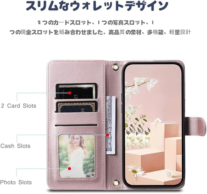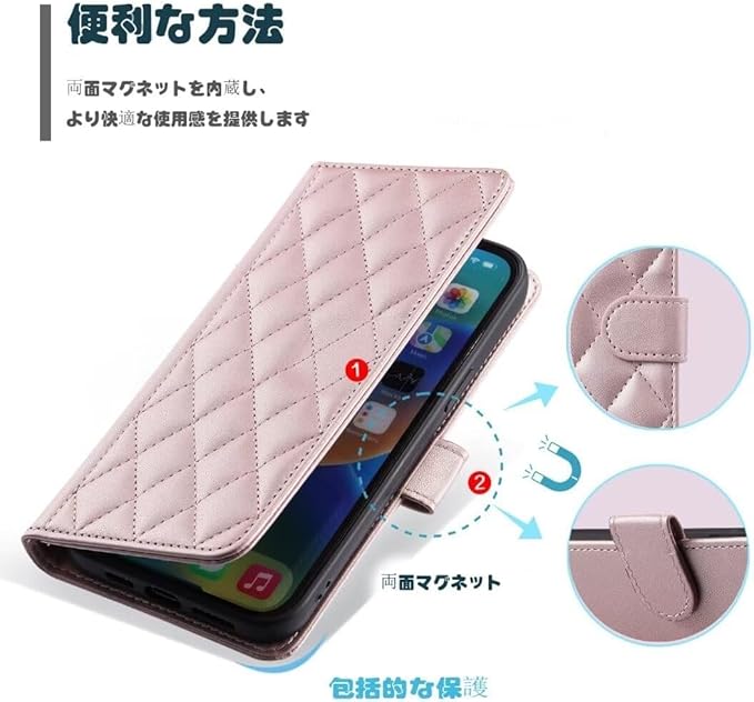 【高品質素材及び設計】大切なスマホを守る安心の手帳型。内部は衝撃吸収性に優れたTPU素材を採用して、落下時の衝撃を効率よく吸収するようにケース の各コーナー内側が設計されています。手触りが良く、キルティングの設計は控えめでエレガントです。