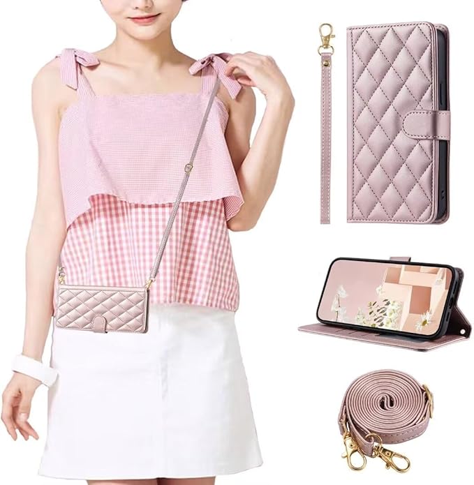 と互換性のある iPhone 17 Pro Max ケース 手帳型 いPhone17 Pro Maxスマホケース 手帳型 ストラップ付 アイフォン17プロマックス 財布型ケース携帯カバー PUレザー スタンド機能 カード収納 ストラップ付き チェック柄 刺繍 ケース アイフォン17プロマックス 財布型カバー【 ストラップ 長+短 2本】全面保護(ピンク)