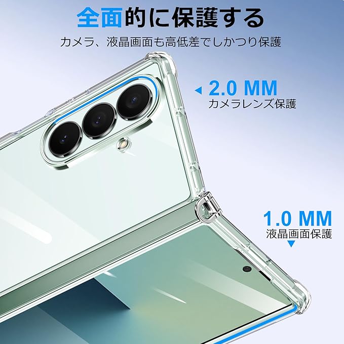 【衝撃吸収】四隅に施したエアクッションの加工で衝撃を吸収します。面と背面カメラ部のフチを高く設計し、液晶画面とカメラレンズをキズから保護します。 スマホを机などの平面に置いた場合に、液晶画面とカメラレンズが接触してできるキズが最小限に抑えられるよう、表側(液晶画面側)は1.0mmの、裏側(背面側)は0.5mmの高低差をつけ、ちゃんと携帯を保護することができます。