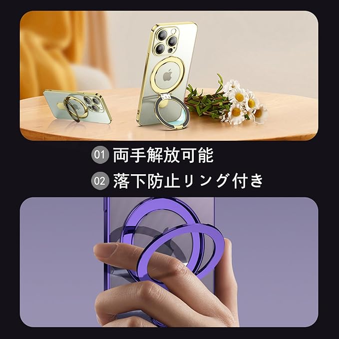 【リング付き 両手解放】:スタンド機能があるとドラマ、動画を見るのがとても便利、両手解放できます。リングを引き上げて指を通せば落下防止になり、片手でも安定した操作も可能に。また、左下にはストラップホールがあり、お好きなストラップを付けられます。