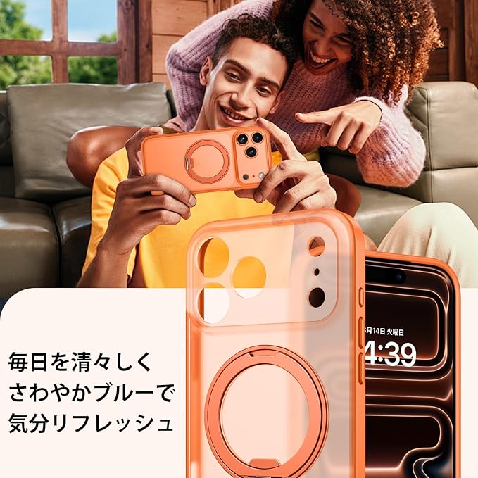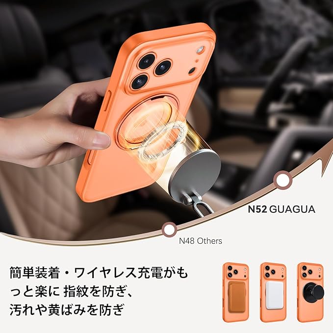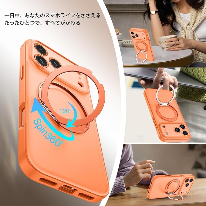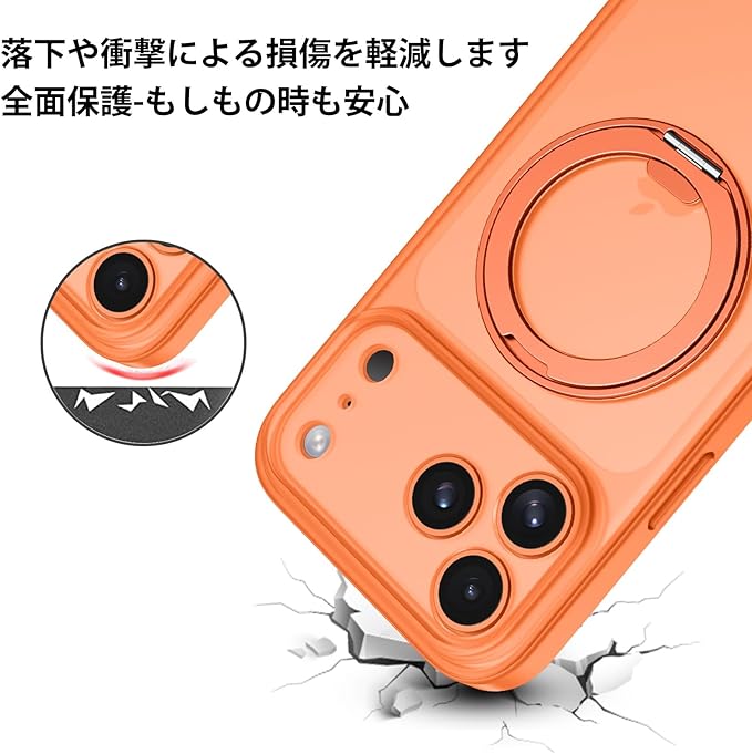 GUAGUA iPhone 17 Pro Max ケース Magsafe対応 ワイヤレス充電 回転スタンド マット感 いPhone プロマックス 肌触り 滑り止め 人気 軽量 マグセーフ耐衝撃 おしゃれ 黄ばみなし あいふおん17Pro 米軍規格 金属キックスタンド スマホケース あいふおんPro Max 用カバー(オレンジ)