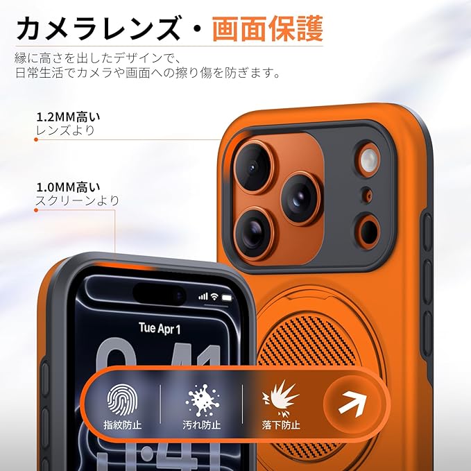 対応iPhone 17 Pro Max用 ケース magsafe対応 リング付き 耐衝撃 米軍MIL規格 リング マグネット搭載 ワイヤレス充電可能 多機能360度回転 指紋防止 黄変防止 車載ホルダー オレンジ C99-ip17pm-05