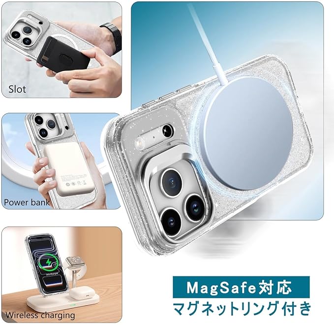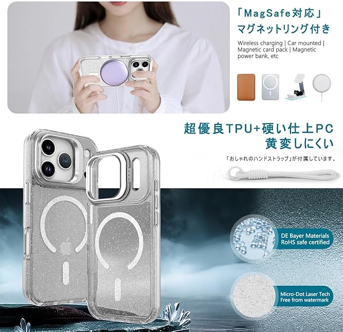 【高級感漂うキラキララメ】【折りたたみ式の隠れスタンド・MagSafe対応・ハンドストラップ】【超優良TPU+硬い仕上PC、黄変しにくい】【米軍MIL規格】【美しい・精密な設計】