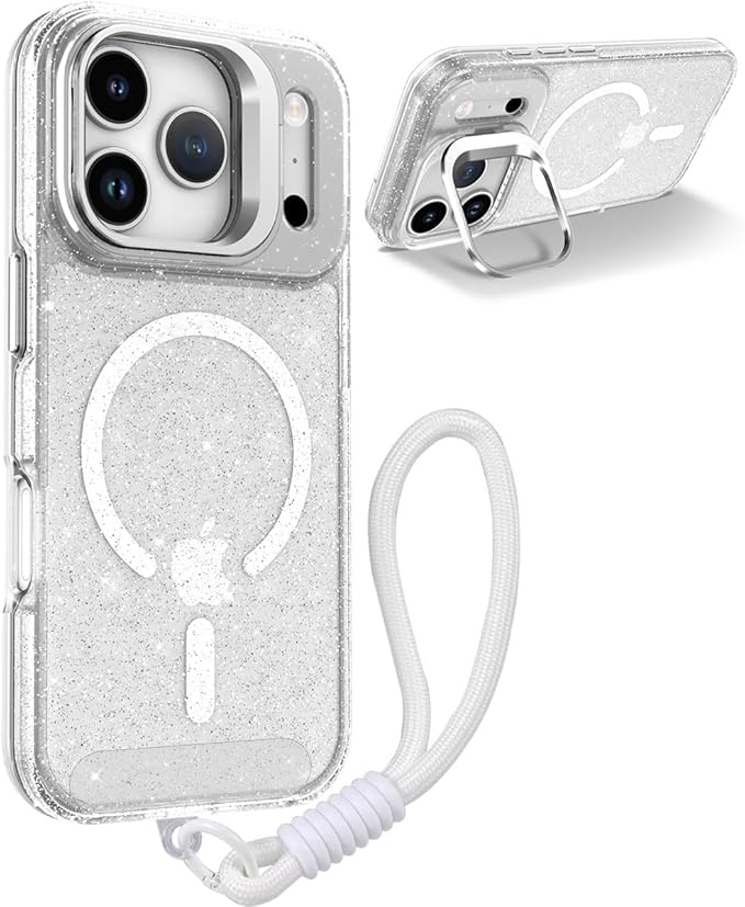 for iPhone 17 Pro Max ケース キラキラ ラメ クリア 韓国 隠れスタンド MagSafe対応 いphone17ProMax ケース ハンドストラップ付き カメラスタンド 米軍MIL規格 耐衝撃 防指紋 アイフォン アイホン 可愛い おしゃれ (透明) PCSF-17ProMax-tou