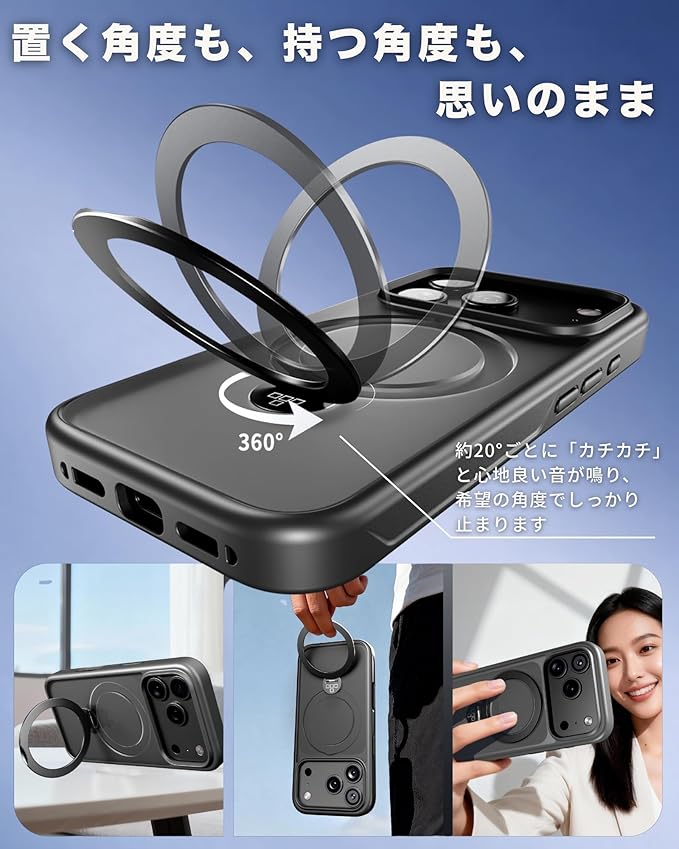✅【 カチッと自由に 角度を調整 】 iPhone 対応スタンドケースはスタンドを回転させると「カチカチ」と心地良い音が鳴り、希望の角度でしっかり止まり調整が可能です。類似の回転式のリングスタンドにありがちな「角度が決まらない問題」を解決します。