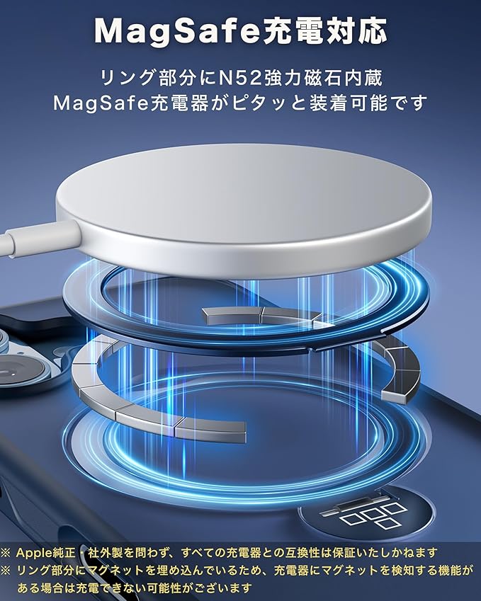 ✅【 MagSafe対応・強力な磁力保持力 】 iPhone 用 ケースのリング部分には、マグネットが内蔵されており、MagSafe充電器やその他のMagSafeマグネットアクセサリーをしっかりと固定します。MagSafeアクセサリーと互換性があり、安心してご利用いただけます。※本製品はMagSafeデバイス専用で、QIワイヤレス充電には対応しておりません。予めご了承ください。
