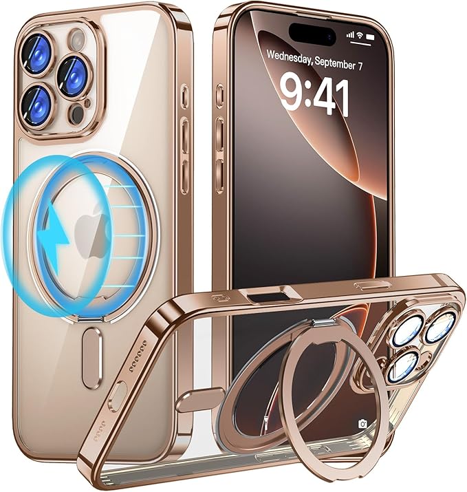 iPhone 16 Pro Max 用 MagSafe対応 ケース 360 回転しスタンド+リング付き アイフォン16 プロ マックス 携帯ケース 一体型カメラレンズ保護 電気メッキバンパー OURJOY スマホケース クリア 軽量 耐衝撃 ワイアレス充電対応 ストラップホール付き・デザートチタニウム