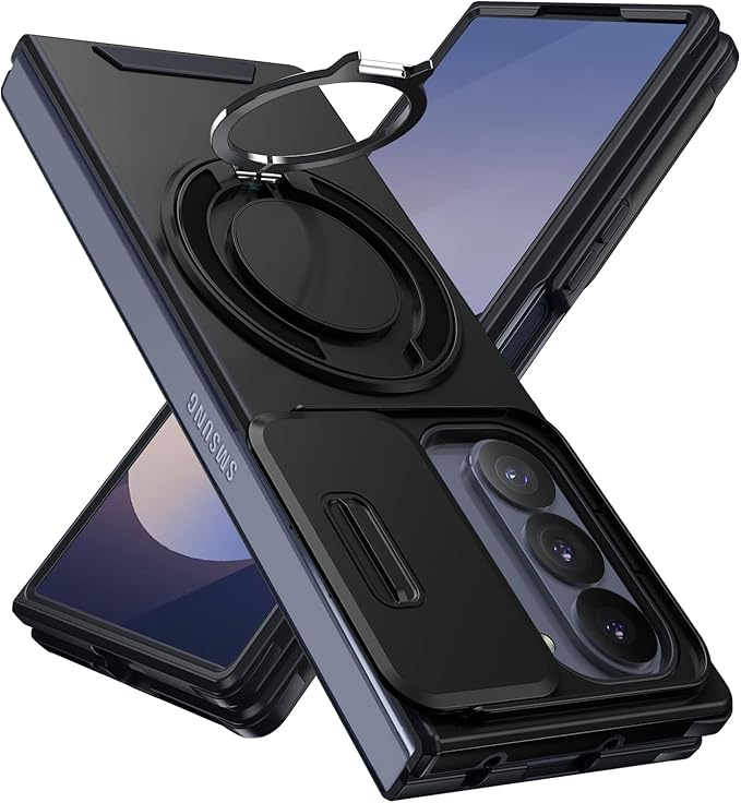 Galaxy Z Fold7 用 ケース リング付き スライド式カメラカバー 隠しスタンド 耐衝撃 スタンド機能 縦横両対応 車載ホルダー PC TPUバンパー 防塵 人気 落下防止 滑り止め 指紋防止 ギャラクシー Z フォールド7 5G カバー 黒 MJJ-1065-07-01