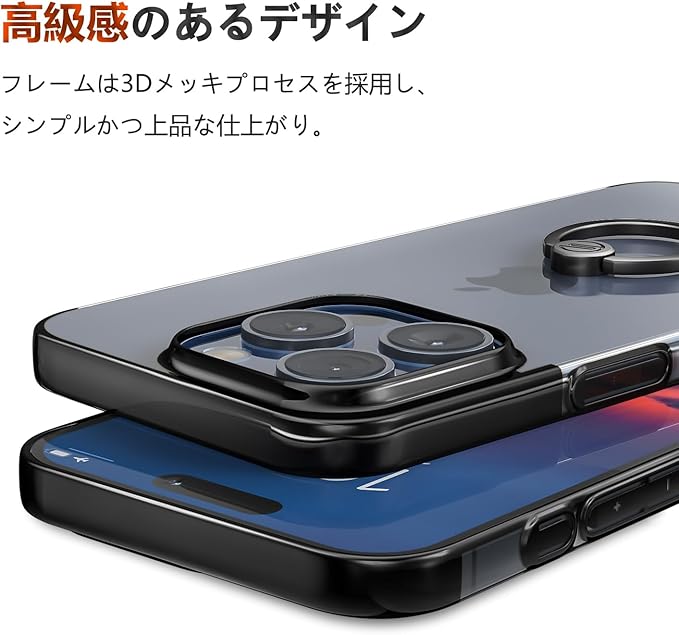 Compatible with リング ケース iPhone 15 Pro Max ケース リング付き スタンド機能 メッキ加工 透明 PC 落下防止 薄型 軽量 一体型 おしゃれ 全面保護カバー 6.7インチ (iPhone 15 Pro Max, ブラック)