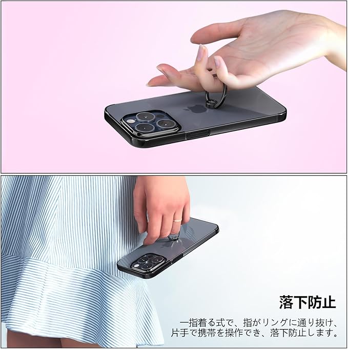 【リング付き】後ろに付いているフィンガーリングはスタンド機能はもちろん、滑りにくくて持ちやすい、安定的なグリップが特徴です。リングはケースにしっかり固定されていて、縦置き、横置きどんな角度でも固定できます。360度回転可能、180角度調節可能。