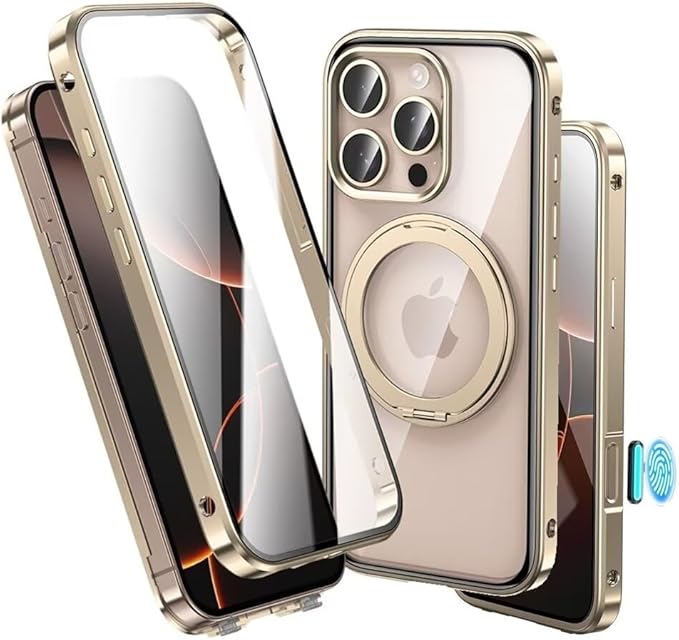 カメラコントロールボタン 360 回転スタンド スタンド機能 iPhone 16 Pro Max 用 クリア 両面 ケース ロック機能 MagSafe対応 ワイヤレス充電対応 アルミバンパー リング付き 両面ケース 強化ガラス アイフォン16promax スマホケース,ゴールド
