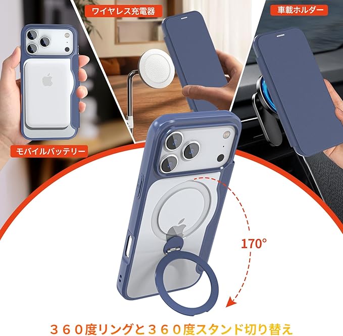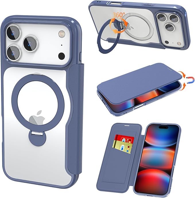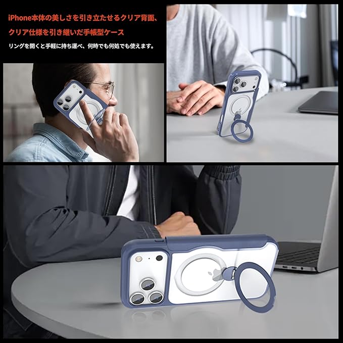 iPhone 17 Pro Max 用 ケース 手帳型 カード収納 背面クリア MagSafe対応 リング付き 360 回転スタンド軽い 薄型 耐衝撃 全面保護 縦横両対応 レザー素材 マグセーフ対応 おしゃれ 青