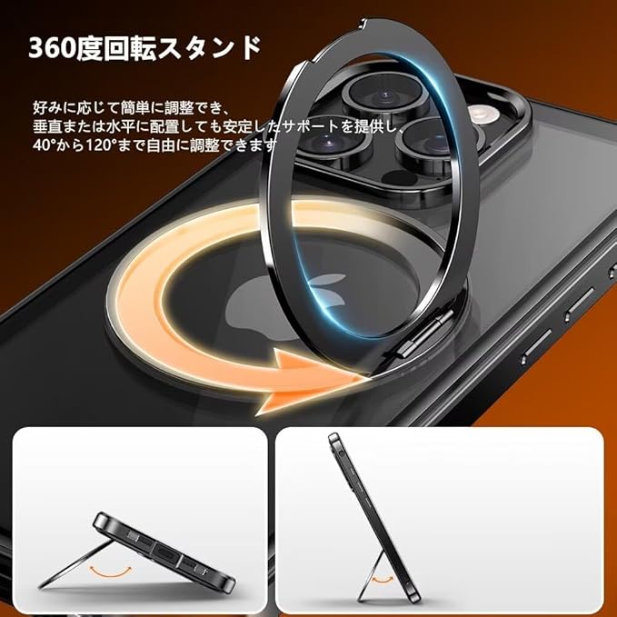 MagSafe充電対応+360 回転スタンド:MagSafe対応充電器および各種アクセサリーが利用できます、ケースと一体型のスタンドは、360度回転可能で、縦置きでも横置きでも安定して支えられ、40 ~120 の間で多角度自由に調整できます。り快適な使用体験を提供します。