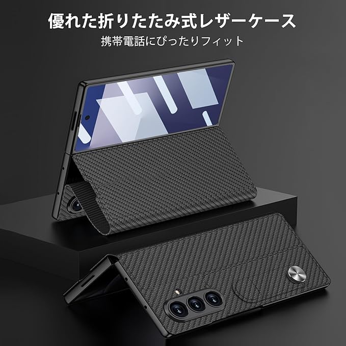 Galaxy Z Fold7 ケース Fold7レザーケース 一体本革/ガラスフィルム付き/手帳型/スタンド機能/ワイヤレス充電対応/カード収納/レンズ保護/耐衝撃/汚れ防止/全身保護 (カーボンファイバー)