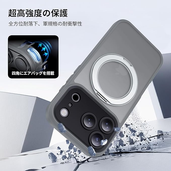 Aunote iPhone 17 Pro Max ケース 精密カメラ保護 360 回転スタンド MagSafe対応 薄型 軽量 米軍MIL規格 耐衝撃 黄変防止 スマホケース いphone17promax ケース カバー グレー