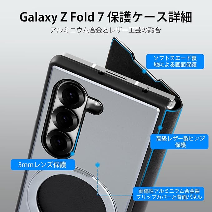 Samsung Galaxy Z Fold 7用のケース ギャラクシー Z fold 7用のフリップケース 金属 360度回転スタンド ワイヤレス充電可能 角度調整スタンド メタル 薄型ギャラクシー Z Fold 7用のカバー 指紋防止 擦り傷防止 耐衝撃 米軍規格 縦横両対応 落下防止 レンズ/カメラ保護 ブディスプレイ側もしっかり保護 天然チタン