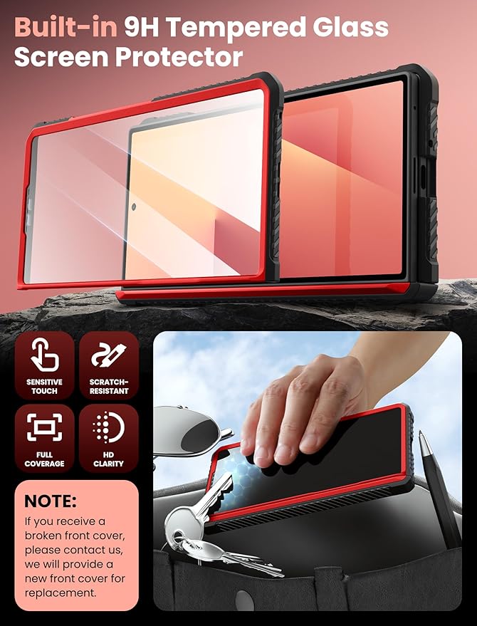 【内蔵HDスクリーンプロテクター】:フロントフレームには、光透過率95%以上の0.33mm HD強化ガラスプロテクターが内蔵されており、タッチ感度を損なうことなく傷から保護します。