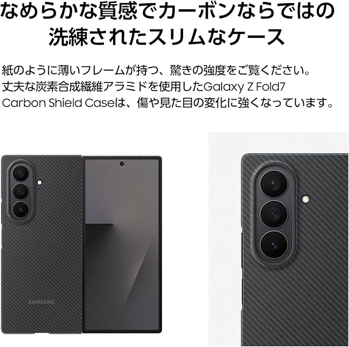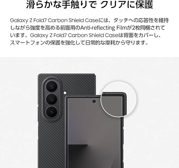 ・超薄型のCarbon Shield Caseが Galaxy Z Fold7に対応。Galaxy Z Fold史上最も薄いデバイスに対応した、史上最薄のGalaxy Z Fold7 Carbon Shield Caseをご紹介します。厚さはわずか0.8mm。スマートフォンの保護を強化しながら、変わらない快適な握り心地を実現します。 ・なめらかな質感でカーボンならではの 洗練されたスリムなケース。紙のように薄いフレームが持つ、驚きの強度をご覧ください。丈夫な炭素合成繊維アラミドを使用したGalaxy Z Fold7 Carbon Shield Caseは、傷や見た目の変化に強くなっています。 ・滑らかな手触りで クリアに保護。Galaxy Z Fold7 Carbon Shield Caseには、タッチへの応答性を維持しながら強度を高める前面用のAnti-reflecting Filmが2枚同梱されています。Galaxy Z Fold7 Carbon Shield Caseは背面をカバーし、スマートフォンの保護を強化して日常的な摩耗から守ります。